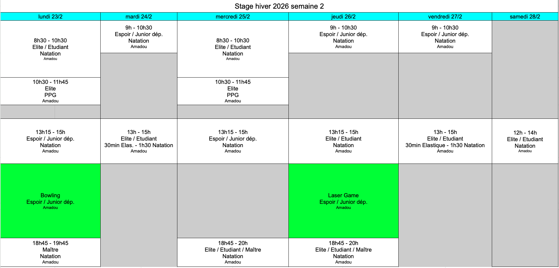 Vous trouverez ci-dessous le planning du stage d'hiver.