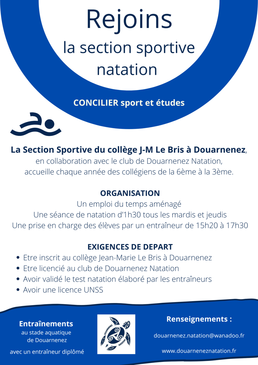 Pour plus d'informations : https://www.douarneneznatation.fr/en-savoir-plus/la-section-sportive-de-natation-164630