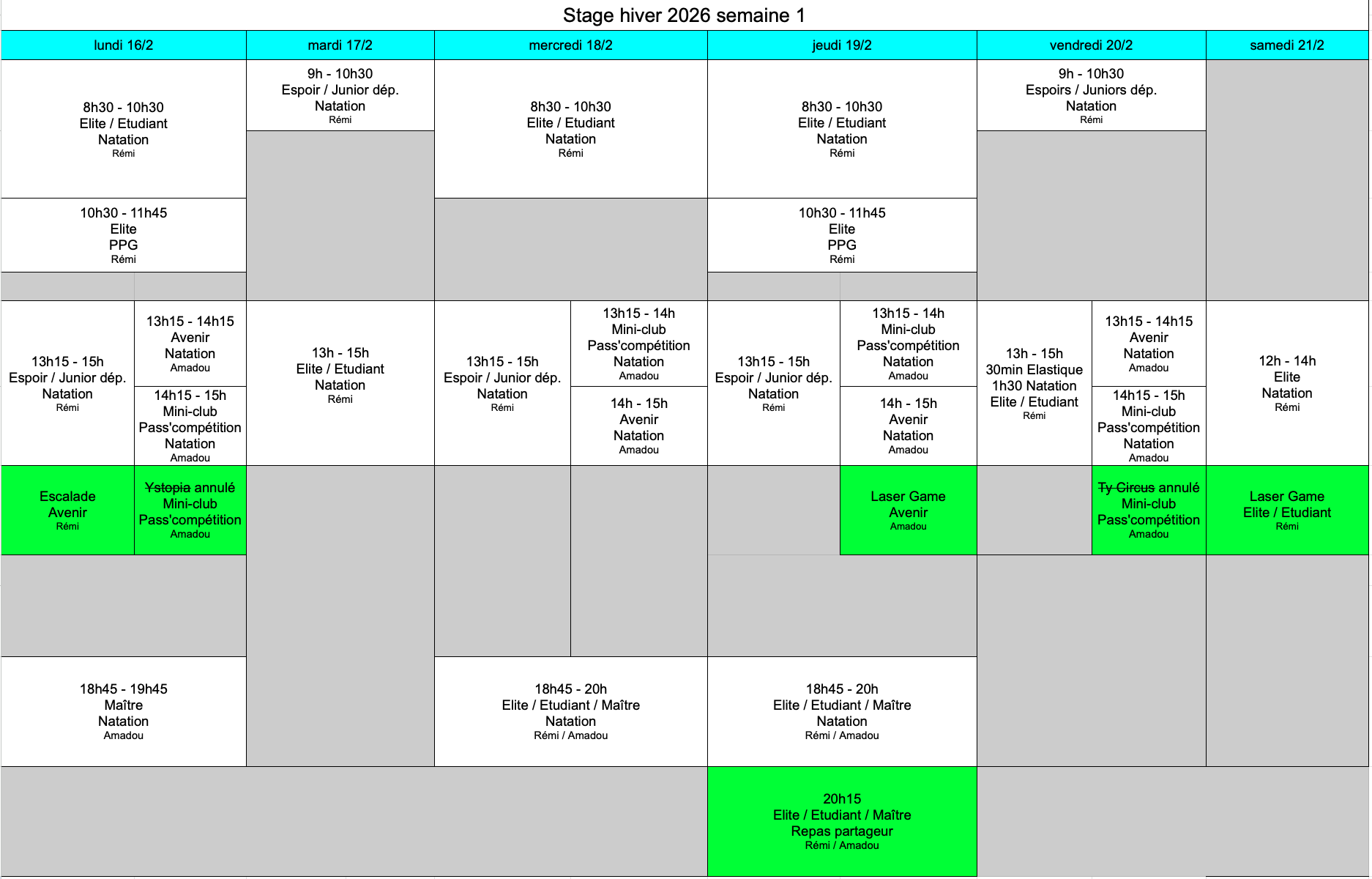 Vous trouverez ci-dessous le planning du stage d'hiver.